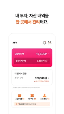 Syrup에서는 모은 포인트와 포인트로 투자한 자산을 한 눈에 확인할 수 있습니다. 내가 가진 은행, 카드, 증권, 보험 정보를 마이데이터로 연결하고 자산 위젯으로 쉽게 관리할 수 있습니다.