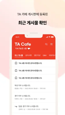 최신 게시물 기능은 TA 카페에 등록된 최신 게시물을 한 눈에 볼 수 있으며, 중요한 게시물은 리스트 상단에서 구분하여 확인할 수 있습니다. 게시물 등록 및 수정 및 삭제 기능은 모바일로 간편하게 글쓰기가 가능하며, 본인이 등록한 게시물을 수정 또는 삭제할 수 있습니다.