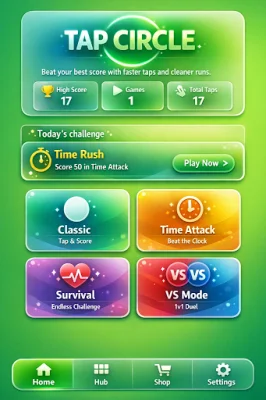 Tap Circle offers multiple game modes to keep things interesting. In Classic Mode, you can enjoy the original challenge with limited lives and pure reflex-based gameplay. Time Attack mode allows you to race against the clock and score as many points as possible before time runs out. Survival Mode offers an endless increasing difficulty, testing how long you can maintain your focus. And in VS Mode, you can challenge a friend in local competitive gameplay to see who has the faster reflexes.