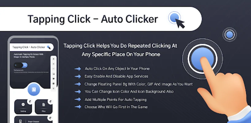 This application allows users to easily win games by automatically clicking on any object on their phone. It eliminates the need for users to constantly tap on an object to win the game, as it will continuously click on the object for them. The app also offers customizable floating panels that allow for multiple clicking points and swipes on the phone's screen.
