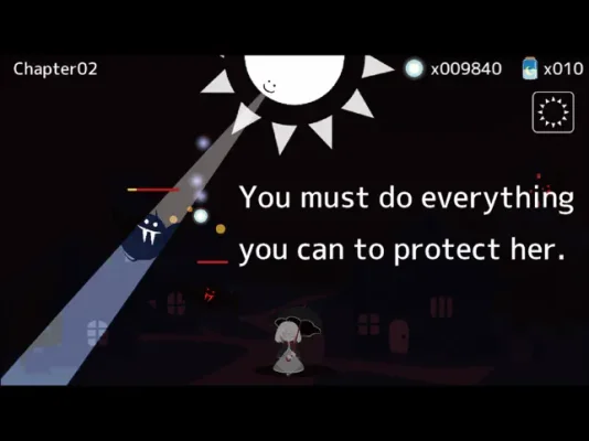 In this game, players must control the direction of the sun's rays to protect a girl from approaching monsters. By rotating the sun to the right while touching the screen and to the left when releasing, players can drive off the monsters and keep the girl safe. However, they must be careful not to shine the light on the girl while her parasol is down, as this will cause her to take damage. If players continue to shine light on her, she will eventually turn to ash and the game will end.