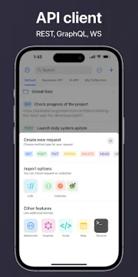 The application also offers customizable settings, such as the ability to skip TLS, disable redirects, and adjust timeouts. It also has the option to enable weak SSL verification and replace it with a self-signed certificate. Users can also import requests or collections from various sources, including curl, links, or files from their device. The application supports various types of collections, such as Swagger, OpenAPI, Postman, and YAML.
