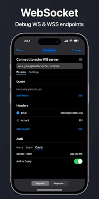 In addition to HTTP requests, this application also has a WebSocket testing tool, which can handle connection and message exchange via WS or WSS. It also supports API calls with various types of request data encoding and transfer types, such as query params, URLEncoded params, FormData, raw data, and even sending files from device storage, cloud, or remote server.