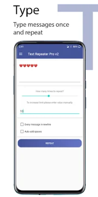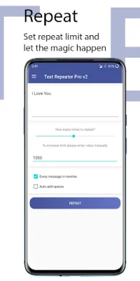 Forget about typing long messages just to impress someone or grab their attention. With Text Repeater, you can easily type your desired message and repeat it as many times as you want, then share it with anyone you choose. This app is perfect for use in social media posts, comments, and messages, allowing you to leave your mark everywhere you go. One of the key features of Text Repeater is the ability to type a message once and repeat it as many times as you want. This saves you time and effort, especially when you want to send the same message to multiple people. You can also repeat any text you want, as many times as you want, giving you endless possibilities for fun and creativity. Another useful feature of Text Repeater is the ability to send messages on WhatsApp without having to save the recipient's number. This is perfect for situations where you may not want to add someone to your contacts, but still want to send them a message. Additionally, the app allows you to convert text to emoji art, making your messages more visually appealing and entertaining. If you're in the mood to play a prank on your friends, Text Repeater has got you covered. You can use the app to troll your friends on any messaging platform, adding a touch of humor to your conversations. And when you're ready to share your repeated message, you can do so on all major social platforms or simply copy it to your clipboard. Text Repeater is available on all devices running 4.0 and above, and it has an extremely low RAM usage. This means that you can use the app without worrying about it slowing down your device. Additionally, the app does not have any background services running, saving your battery life. The user interface of Text Repeater is simple yet effective, making it easy for anyone to use. You don't need to be tech-savvy to navigate the app and take advantage of all its features. However, it's important to note that this app is only for fun purposes. It includes functionalities like WhatsDirect, Click To Chat, and Direct message for WhatsApp, as well as TextArt, Text To Emoji, Emoji Art, Text To Emoji Art, and Emojify. It's worth mentioning that all messaging and social app names and screenshots used in the app description or screenshots belong to their respective owners. The app developers have no direct link with any of them and encourage users to be original and SEO-oriented in their messages. So why not give Text Repeater a try and have some fun with your messages?