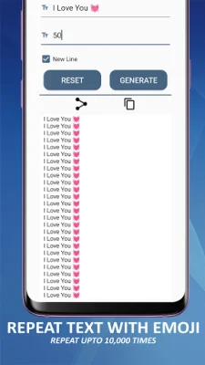 Text Repeater is an innovative application that allows users to create unique and eye-catching messages. With its key features, users can easily repeat text or emojis multiple times, generate random characters or numbers, express their feelings through ASCII emoticons, and even send blank text to surprise their friends. The app also allows users to share their repeated text on social media or copy it to post on various platforms. One of the main features of Text Repeater is the ability to repeat text or emojis up to 10,000 times. This is perfect for creating attention-grabbing messages or for emphasizing a certain point. Users can also choose to generate random characters, numbers, or a combination of both, adding a fun and unpredictable element to their messages. Another unique feature of Text Repeater is the ability to use ASCII emoticons to express emotions. This adds a personal touch to messages and allows users to convey their feelings in a creative way. Additionally, the app allows users to send blank text, which can be used to surprise and intrigue their friends. Text Repeater also offers convenient functionality, such as the option to repeat messages with each line in a new line or with an index number. Users can also set their own repetition limit and easily copy and paste the entire repeated message. And with just one click, users can reset all settings and start fresh. In summary, Text Repeater is a must-have app for anyone looking to create unique and original messages. With its various features and user-friendly functionality, it is the perfect tool for standing out on social media or impressing friends and family. So why wait? Download Text Repeater now and unleash your creativity!