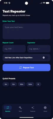 In addition to the custom separator, the app also offers Quick Presets for one-tap preset counts. These presets include 10x, 50x, 100x, 500x, and 1000x, making it even easier for users to quickly repeat their desired text without having to manually input the number of repetitions.