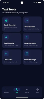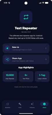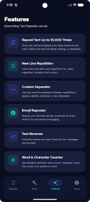 In addition to the repeating features, the app also offers other useful tools such as Text Reverser, which instantly reverses any text, and Word Counter, which counts the number of words, characters, characters without spaces, lines, and sentences in a given text.