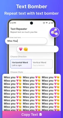 One of the key features of Text Bomber is the ability to enter your desired text and specify how many times you want it to be repeated. You can also choose to align the repeated text horizontally or vertically, giving you more control over the appearance of your message. Additionally, you can customize the length and spacing of the repeated text, copy and share it, or save it as a favorite for future use.
