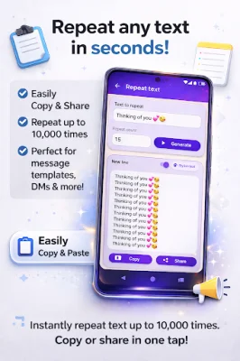 Text Repeater is an application that allows you to quickly and easily repeat any text in seconds, add stylish effects, generate blank (invisible) text, or create vertical emoji blocks. Its main goal is to help you copy and paste faster, making it a useful tool for various purposes. With Text Repeater, you can repeat text up to 10,000 times for fast copy and paste. You also have the option to add a new line between repeats or keep it tight. Additionally, the app offers various stylish text effects and fancy fonts for messages and captions, making your text stand out. One unique feature of Text Repeater is the ability to generate blank text, which appears invisible when sent. This can be useful for sending empty-looking messages or for playing pranks on friends. The app also allows you to turn text into vertical text or letter-by-letter lines, creating unique and eye-catching layouts. Another fun feature of Text Repeater is the ability to build big letters with emoji blocks. You can choose between normal or HD emoji blocks and even add primary, alternate, and optional background emojis for added customization. The app also allows you to copy or share your text instantly to any other app. People use Text Repeater for a variety of reasons, including quick replies and message templates, love messages and flirting, captions and comments, clean formatting for bios and profiles, invisible text tricks, and cool emoji art and vertical layouts. Using Text Repeater is simple and straightforward. You first choose a tool, such as repeat text, stylish text, blank text, or vertical text. Then, you type your message and add emojis if desired. Next, you set the repeat count or select an effect, and preview the result. Finally, you can tap copy or share to use the text in any other app. One of the best things about Text Repeater is its simplicity, speed, and lightweight design. You don't need an account to use it, and the user interface is designed for one-hand use. The app is optimized for speed, allowing you to quickly generate, copy, and paste your text. In conclusion, Text Repeater is a useful and versatile application that can help you save time and make your messages stand out. Whether you need to quickly copy and paste text, add stylish effects, or create unique layouts, Text Repeater has you covered. Give it a try and see how it can enhance your messaging experience.
