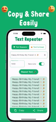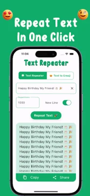With its seamless integration with WhatsApp, Text Repeater - Emoji Repeater makes it easy to share your repeated texts and expressive emojis directly on the messaging platform. This enhances your conversations and makes every message stand out. You can also copy and share your creations on various platforms, including social media and messaging apps, making it easy to spread joy and creativity with every share. Download Text Repeater - Emoji Repeater now and unlock the power of expressive communication in your messages.