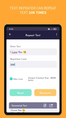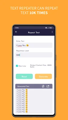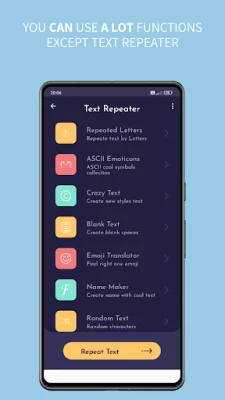 Easily repeat text up to 10,000 times with Text Repeater. This application offers a variety of features to enhance your messages and make them stand out. With Text Repeater, you can repeat text, create crazy text, repeat letters, and even translate text into emojis. It also has a name maker and a collection of ASCII emoticons to add some fun to your messages. And if you're feeling adventurous, you can generate random text with just a click.