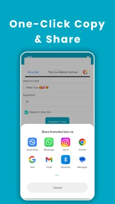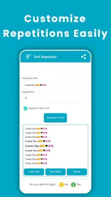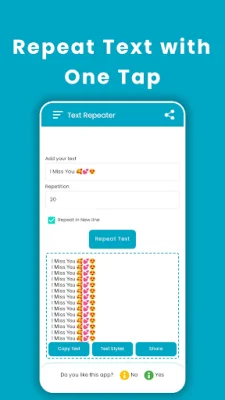 Welcome to Text Repeater, the ultimate tool for generating repeated messages, emojis, and characters instantly. This app is perfect for pranking friends, expressing love creatively, or simply having fun on social media. With Text Repeater, repetition is made easy, fast, and fun!