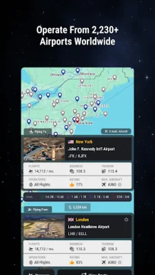 Design your own aircraft liveries and airline logos with our innovative application. With over 70 planes to choose from, you can fly to more than 2,230 airports worldwide. Our app supports a wide range of global airports, each with its own unique operations and aircraft limits based on real-life data. Popular airports even come with custom illustrations to enhance your flying experience.