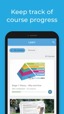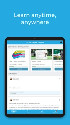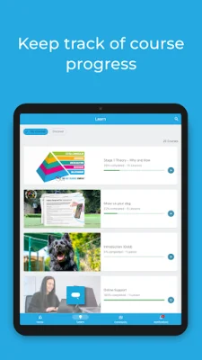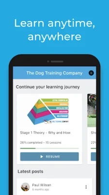 The Dog Training Company mobile app is a convenient and flexible way to learn and connect with professional trainers anytime and anywhere. With this app, you have access to your personalized course and trainer support all in one place. Whether you're at work, at home, or on your commute, you can easily learn through video lessons, learning guides, quizzes, and assignments that are optimized for mobile devices. Plus, with progress tracking and the ability to start and stop lessons, you can easily pick up where you left off.