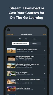 One of the key features of The Great Courses app is the ability to stream any course that has been purchased. This requires an internet connection, but it allows users to access their courses on the go. The app also offers the option to seamlessly switch between video and audio versions of lectures, providing flexibility for different learning preferences.