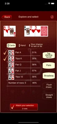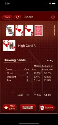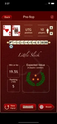Some of the standout features of the app include its easy card selection process, starting hand expected value indicator, and the ability to calculate chances of winning or tying against 1 to 9 players. It also has a feature that allows users to calculate their chances against groups of cards, which is especially useful for high stakes games. The app also offers the option to calculate odds against 1 to 7 known opponent pocket cards, which can be used to analyze past games or create scenarios for future games.