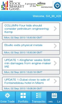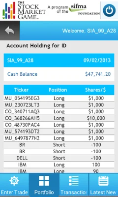 The SMG mobile app is a useful tool for students who are participating in the SMG student team portfolios. It enhances their learning experience by providing them with a second screen experience that is both engaging and meaningful. This app is designed to work alongside the standard SMG portfolios, providing students with up-to-date information on their account summary, pending transactions, transaction notes, and market news. Additionally, the app allows teams to easily look up ticker symbols and enter trades.