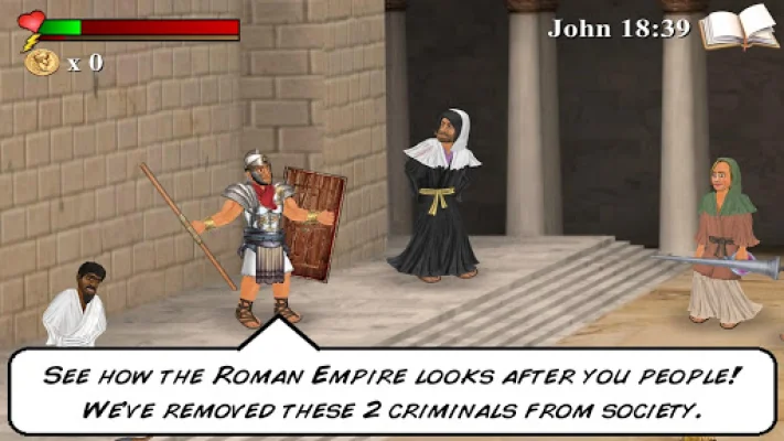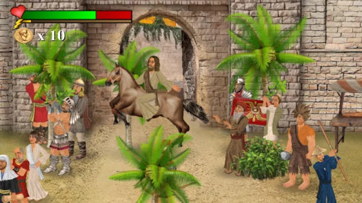 The game has basic controls that can be accessed at any time by tapping the health meter to pause. These controls include using the D-Pad to run, A to attack, G to grapple, P to pick up or drop objects, U to use objects, and the Eye button to sleep or meditate. The game also features a pause/exit button, a Bible reference book, and the ability to zoom in and out by pinching the screen.
