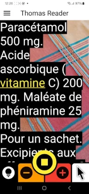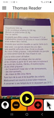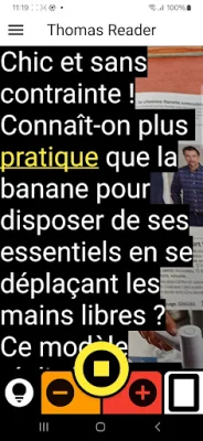 THOMAS READER est une application conçue pour aider les personnes malvoyantes et déficientes visuelles à mieux lire, ainsi que pour assister les patients dyslexiques et souffrant de troubles d'apprentissage de lecture. Son utilisation est simple et pratique, car elle utilise la caméra du smartphone pour fonctionner. Pour commencer, il suffit de viser le texte à l'aide de la caméra, d'appuyer sur le bouton central et la lecture vocale commence automatiquement. Le texte est alors affiché à l'écran et défile au fur et à mesure de la lecture. De plus, l'application offre de nombreux réglages personnalisables tels que la taille des lettres, la vitesse de lecture et le défilement.