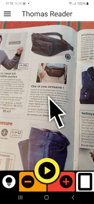 THOMAS READER propose deux modes de lecture pour s'adapter aux besoins de chaque utilisateur. Le premier est le mode Flèche, qui permet de lire le bloc de texte pointé par la flèche au centre de l'écran. Ce mode est particulièrement pratique pour lire une information précise dans un texte plus long. Le second mode est le mode Page, qui permet de lire l'intégralité du texte. Ainsi, l'application peut être utilisée pour lire différents types de textes tels que des articles de journaux, des magazines, des notices, des courriers, des livres, des e-mails sur l'écran d'un ordinateur, des panneaux de rue, des menus ou encore des vitrines.