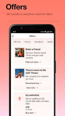 For those who are interested in rewards and community engagement, the app offers quick access to Three+ rewards and the Three Community. Three+ rewards allows you to earn points for various activities, such as paying your bill on time, and redeem them for discounts and rewards. The Three Community is a forum where you can connect with other Three customers, ask questions, and share your experiences.