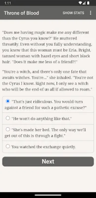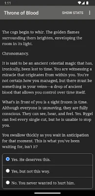 "Throne of Blood" is an interactive novel written by Kezia S. that allows you to create your own story through the power of your imagination. With over 295,000 words, this text-based game does not rely on graphics or sound effects, but rather on your choices and decisions to shape the outcome of the game.