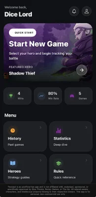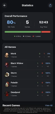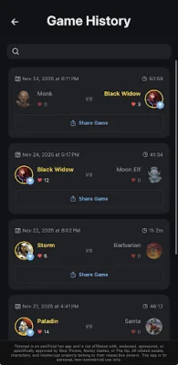 Throned also offers features to track stats and history, automatically recording wins, losses, and win rate. Players can also view character-specific performance to see which heroes they excel with. Recent game history can be browsed with detailed match information, and data can be exported for backup or manually logged for offline games.