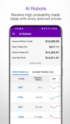 Tickeron is an application that helps users search for and find great stocks to buy and sell. It allows users to follow their favorite stocks and gain a better understanding of the market. With Tickeron, users can create personalized watchlists to track charts, stock quotes, and performance over different time periods. The app also provides access to key fundamentals and technicals, company profiles, charts, projections, and earnings reports. One of the unique features of Tickeron is its ability to update buy and sell recommendations during market trading hours. This allows users to make informed decisions about when and at what price to buy or sell stocks. The app caters to different types of traders, including day traders, swing traders, and long-term stock investors, by providing timely, accurate, and verifiable recommendations and alerts to boost their trading. Tickeron also offers stock ratings, allowing users to create watchlists with personalized live market signals and buy and sell recommendations. These ratings can be filtered by earnings and dividend reports, as well as insider trading. Users can also view the rating history of stocks to validate the accuracy of the app's predictions. This feature helps users save time and maximize their trading profits by only focusing on stocks with particular ratings. In addition to stock ratings, Tickeron provides users with real-time stock market news and quotes. Users can stay updated on breaking news, market updates, and analysis on stock markets and technology. The app also offers live quotes for major indices, stocks, ETFs, mutual funds, and more. Technical analysis signals, such as Moving Averages, RSI, Stochastics, MACD, and Bollinger Bands, are also available to help users make informed trading decisions. Tickeron's stock watchlists and signals feature allows users to track major indices, stocks, and mutual funds in real-time. The app also offers customizable alerts for stocks, ETFs, and other asset classes. Users can set up notifications for specific prices, changes by percentage, or volume. These alerts help users track market changes and make timely investment or selling decisions. For those who are new to trading, Tickeron offers AI robots backed by over 100 backtested algorithms. These robots allow users to select their preferred trading strategy and view live buy and sell trades with potential profit and stop loss. The backtested AI models are updated in real-time, providing users with daily recommendations that have the potential to outperform the market by 50-90%. This feature makes trading accessible to all, regardless of their level of experience.