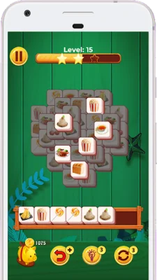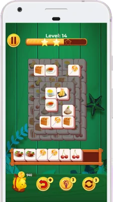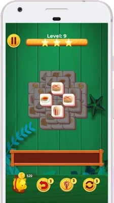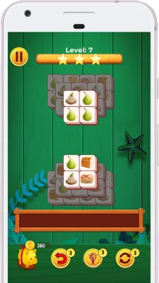 This application is a puzzle game where the objective is to collect three tiles of the same type in order to blast them and progress to the next level. The game is played by tapping on the tiles to collect them. Once all the tiles have been collected, the player wins the level. However, the player must be careful not to fill the box with too many tiles, as this will result in a failure.