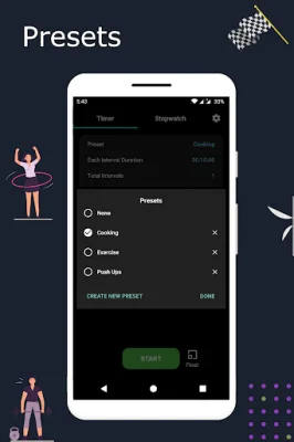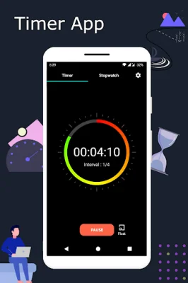 The app has a simple and visually appealing user interface with material design and animations. It can be used in the background while using other apps or with the screen locked, making it convenient for multitasking. Users can also create templates for different activities, making it easier to switch between timers.