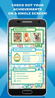 This application is designed to help users learn and improve their multiplication skills through a fun and interactive game. Each correct answer reveals a part of a puzzle, and the goal is to open the entire puzzle with the least amount of errors. Points are awarded for different achievements and correct answers, which contribute to the player's overall rating.
