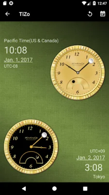 The app also includes a subscreen that allows users to convert time in two different time zones. This screen is similar to the main screen, but with the added feature of being able to drag the dial to change the time. Users can simply trace their finger on the dial to adjust the time in their chosen time zone. The minute hand of the clock can also be moved for more precise time adjustments.