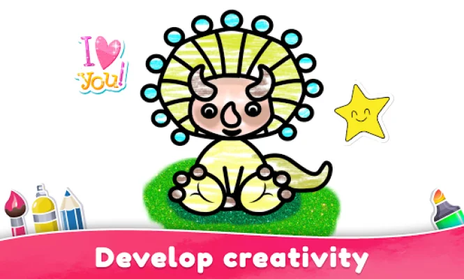 This application is a coloring app designed for kids to have fun while learning. It offers a variety of coloring pages and games that are both creative and educational. The app is available on Android devices and includes categories such as school, vehicles, animals, food, love, robots, clothes, dinosaurs, and free draw.