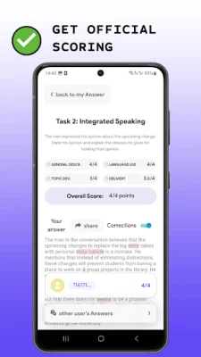 In addition to the mock tests, this application also offers official scoring for the Speaking and Writing sections of the TOEFL. This means that users can submit their responses for these sections and receive a score, as well as sample answers and corrections to help them improve. This feature is incredibly valuable, as it allows users to assess their strengths and weaknesses and work on improving their skills in these areas.
