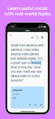 The application also offers a low-pressure environment, allowing users to take their time to respond without the fear of making mistakes. If users miss something the first time, they can listen again at a slower speed or reveal the text and translation. This feature promotes a stress-free learning experience and encourages users to make English speaking a daily habit.