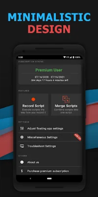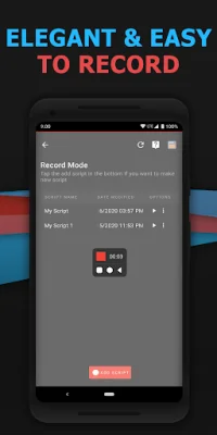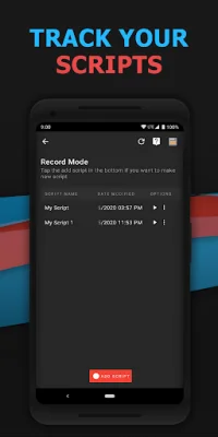 This app is a tool that can be used on Android devices with a version of 7.0 or higher. It does not require the device to be rooted in order to function. The app has two main features: Record Script and Merge Scripts.
