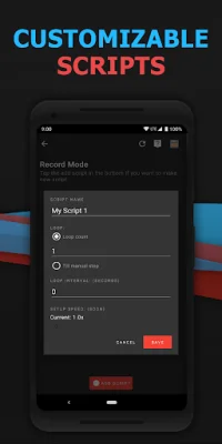 The Record Script feature allows users to record and execute scripts in the same way that they were recorded. Users can set up the names of their scripts, the interval between each action, and the speed at which the script is executed. This feature is useful for automating repetitive tasks on the device, making it easier and more efficient for users to complete them.