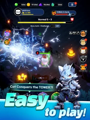 The application is an Idle Action RPG game where the player controls a cat that must fight against increasingly stronger enemies. The goal is to climb the endless tower and defeat enemies using colorful skills, all while avoiding getting lost. The game features easy controls that anyone can learn and the convenience of automatic battles, making it accessible to all players.