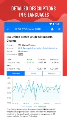 Tradays also supports 9 languages, making it accessible to a wide range of users. Detailed descriptions in these languages help beginners understand the impact of events and indicators on different financial instruments, making the application useful for traders of all levels. With its comprehensive functionality and real-time data, Tradays is a valuable tool for anyone looking to improve their trading strategy.