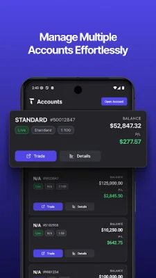 Tradin also offers complete account management, allowing traders to create and manage multiple trading accounts, both demo and live. Real-time balance and portfolio performance monitoring are available, along with flexible leverage options tailored to each trader's strategy. Internal transfers between accounts are also seamless, making it easy for traders to manage their funds.