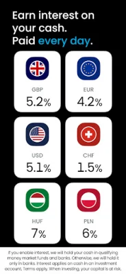 The Invest & ISA feature of Trading 212 offers unlimited commission-free trades and access to over 13,000 real stocks and ETFs from various countries such as the UK, US, Germany, France, Spain, and the Netherlands. Additionally, you can earn high interest on your uninvested cash, with rates varying depending on the currency. The platform also supports a multi-currency account, allowing you to deposit, invest, and earn interest in 13 different currencies.