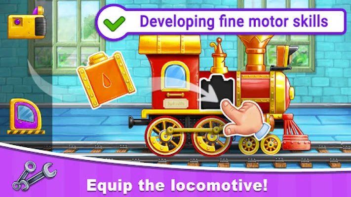 This application is designed to teach children how to build a railroad and create a train station. It offers a fun and interactive way for kids to learn about rail transport and construction through easy games and activities. The game is suitable for preschoolers and is like a toy train, but better! Parents can also benefit from this app by spending quality time with their children and helping them learn in a fun and useful way. Both boys and girls will enjoy exploring the details of railway transport and construction in this educational game. The game features cute characters, different types of railway carriages, and machines used in the process. Through this game, children will learn about the different stages of building a railroad, the services a train needs to function efficiently, and the process of inviting passengers and loading luggage. The app also helps develop fine motor skills, coordination, logic, and attentiveness through activities like assembling puzzles, washing and refueling the train. The app features colorful and interactive graphics, with natural backgrounds for the construction process and passengers boarding the train. Children can also customize their train with different characters, hairstyles, and outfits. The game also includes a realistic process of building a railroad and erecting a station. To create the perfect train, children will have to work hard by buying tickets, arriving at the station on time, and building a comfortable and beautiful train. The game offers a fun and educational experience for preschoolers and kindergarten children. Parents can also share their feedback and impressions with the developers through email or social media.