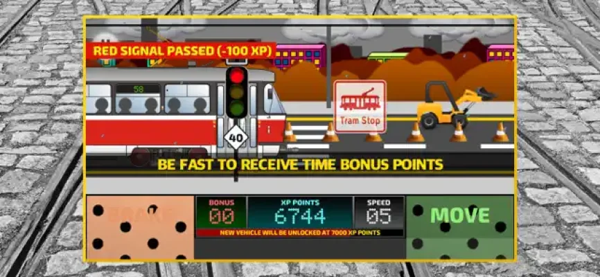 To play, players must use the green pedal to move the tram forward and the red pedal to slow down. They must also pay attention to traffic lights, signs, stations, timetables, and braking intensity. At each station, players must stop the tram correctly and wait for all passengers before closing the doors and continuing on to the final station without getting penalized.