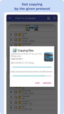 FILES TO COMPUTER is a user-friendly application that allows you to easily back up your files, photos, videos, and music from your device to your computer or NAS server with just one click. It also helps you free up valuable storage space on your device by deleting files after successful backups. This fast and intuitive app is compatible with Android Go devices, making it accessible to a wide range of users. With regular use of FILES TO COMPUTER, you can efficiently manage and back up your files, photos, videos, and music from your device to your computer or NAS server. The app intelligently avoids duplicating existing files and ensures that your backup is organized and up-to-date. Using this app, you can easily connect to your computer or NAS server, select the files you want to back up or transfer, and manage them with a simple click. You can also choose specific file types for faster backups, making the process even more efficient. This app is particularly useful for devices with limited internal storage, those without an SD card slot, or for users who want a hassle-free way to securely back up their files. It is compatible with a wide range of devices, including Samsung Galaxy, Nokia, Motorola, HTC, OPPO, Lenovo, Asus, Sony Xperia, Alcatel, and Vodafone. By backing up your files to your computer, PC, or NAS server, you can ensure the longevity of your important content and memories. The app offers comprehensive and secure file management with its FileBackup, PhotoBackup, VideoBackup, and MusicBackup features, all with a simple one-click process. FILES TO COMPUTER also offers advanced file management capabilities with industry-standard protocols such as Samba (SMB), Secure File Transfer Protocol (SFTP), and File Transfer Protocol (FTP). These protocols allow you to seamlessly share files between devices on your network, safeguard your data during transfers with enhanced security, and have versatile file management options. This app is compatible with Windows, macOS, and Linux, making it accessible to a wide range of users. With its convenient and secure file management features, FILES TO COMPUTER offers a seamless and intuitive file management journey for all your backup needs.