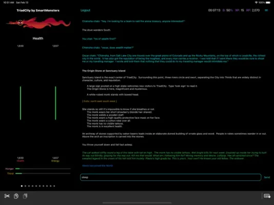 TriadCity is a text-based application that allows users to read and type in order to play. It prides itself on being accessible to all, including blind or visually impaired players. The game is designed to stimulate the imagination and offers a variety of challenges that traditional adventure games cannot. Violence is not necessary to progress in the game, as players can also explore, heal, write, and take other paths to advance. The characters in the game are not just mindless entities waiting to be defeated, but rather have their own homes, jobs, hobbies, and personalities, making the game world feel alive and dynamic. Additionally, the game has a humorous side to it.