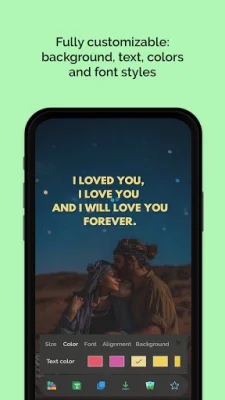 What sets this app apart is its customization options. You can personalize every love message by changing the text color, size, and font style. You can also choose from stunning backgrounds from your gallery, camera, or millions of free photos from Unsplash and Pixabay to make each quote uniquely yours. The app also allows you to save your favorite quotes and easily share them on social media platforms like Facebook, Instagram, Twitter, and WhatsApp.