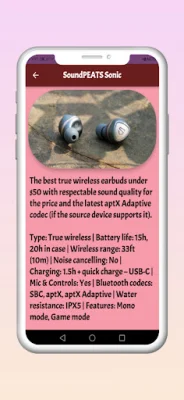 In addition to these general topics, the app also contains specific information about various true wireless earbud models. This includes specifications, manuals, images, features, prices, and instructions for use. Users can also find information about battery life, volume control, language settings, and system requirements for their specific earbud model.