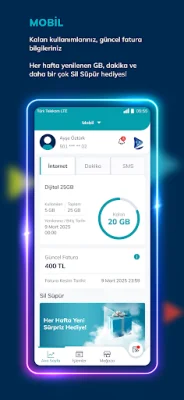 The application allows users to easily manage their mobile, internet, Tivibu IPTV, and home phone accounts all in one place. Users can review their remaining usage, view their current invoice and balance, and even earn gifts by playing Sil Süpür. The gifts are renewed every week, providing users with ongoing opportunities to earn GB, minutes, and other rewards.