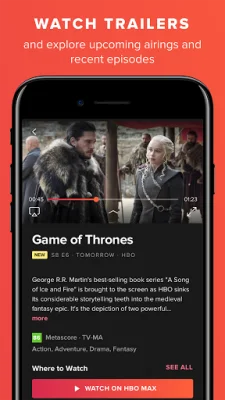 Users can explore TV shows and films to get more information on their favorites and find their next binge. They can watch trailers, clips, behind-the-scenes videos, and interviews about their favorite series, seasons, and episodes. The app also displays details such as premiere date, genres, network and streaming availability, reviews, and Metacritic scores. Users can also browse episodes and view episode details, as well as see the cast and crew involved in the production.