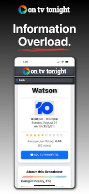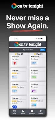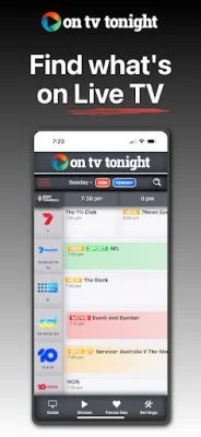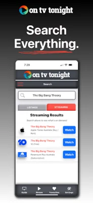 The key features of this app include a live TV schedule for 24 hours across major channels, making it easy for users to plan their viewing. The streaming guide allows users to browse listings for popular platforms such as Netflix, Stan, Binge, and more. The "On Now" highlights feature allows users to quickly see what is currently airing live on TV. The all-in-one search function helps users find where a specific show or movie is available to watch, whether it is live on TV or streaming. Detailed show information is also available, including episode descriptions, cast lists, and upcoming air dates.